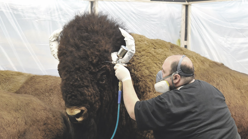 The bison were collected on an expedition the following winter when the animal’s coat was the fullest. The animals were harvested under permission from the United States Biological Survey from the National Bison Range in central Montana established by the American Bison Society in 1904. A “large bull, a medium-sized bull, a large cow, a young cow, a two-year-old spike horn, and a small eight-month old calf” were harvested from a herd of 640. Bison were so few that it was unlikely that they existed in South Central Wyoming at the time Perry Wilson visited. While most dioramas were precise replicas of landscapes as they existed, the Bison Pronghorn Grouping was an exception, it purposefully recalled bison and pronghorn populations of the 1820s to educate the public of their near eradication and revival through ongoing conservation efforts.
